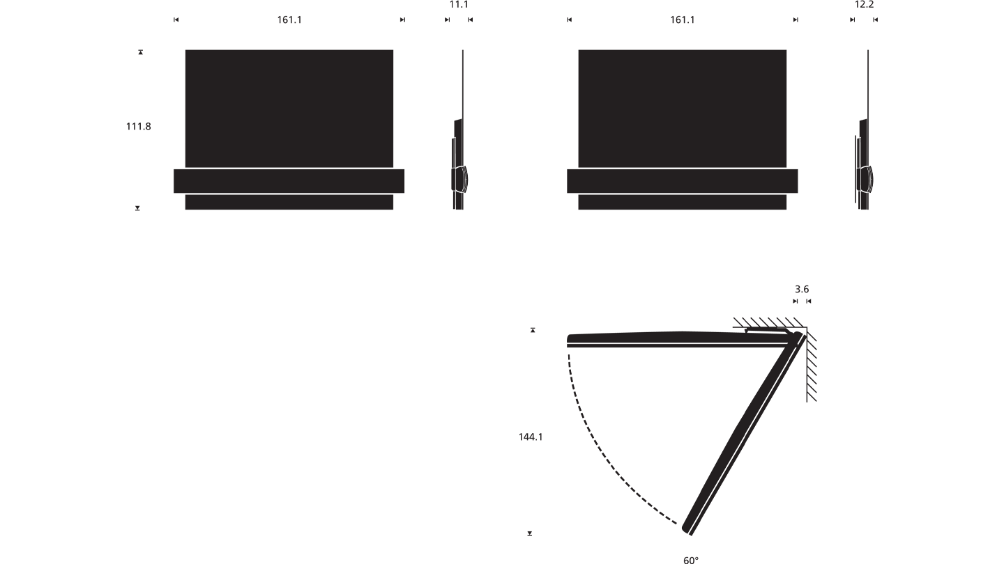 65" floor standing: 136 h x 161.1 w x 51.8 d cm 65" wall bracket: 111.8 h x 161.1 w x 12.2 d x 144.1 opening depth cm