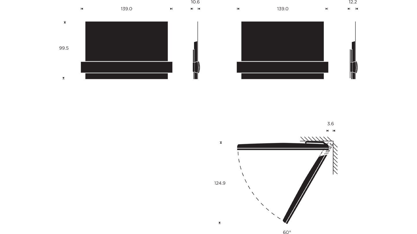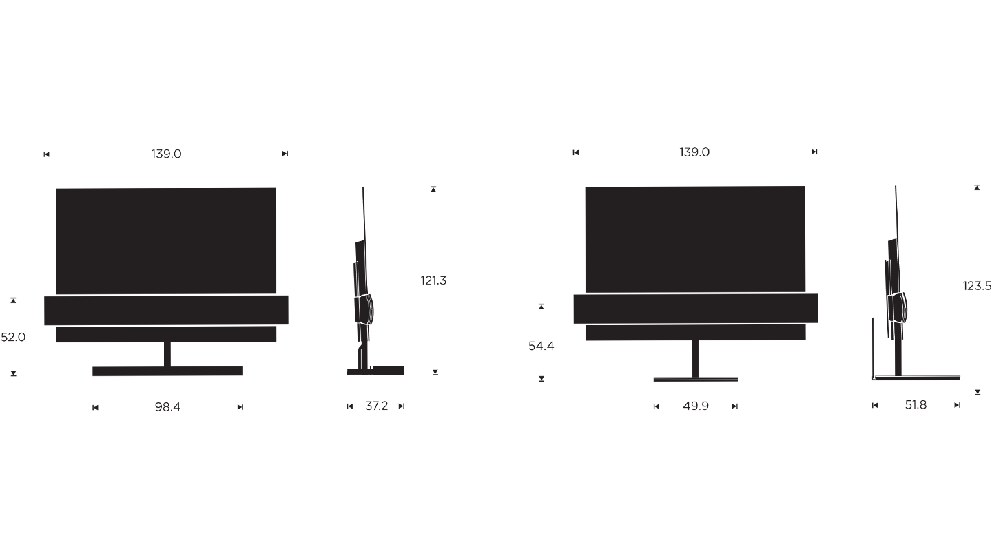 55" floor standing: 123.5 h x 139 w x 37.2 d cm 55" wall bracket: 99.5 h x 139 w x 12.2 d x 124.9 opening depth cm